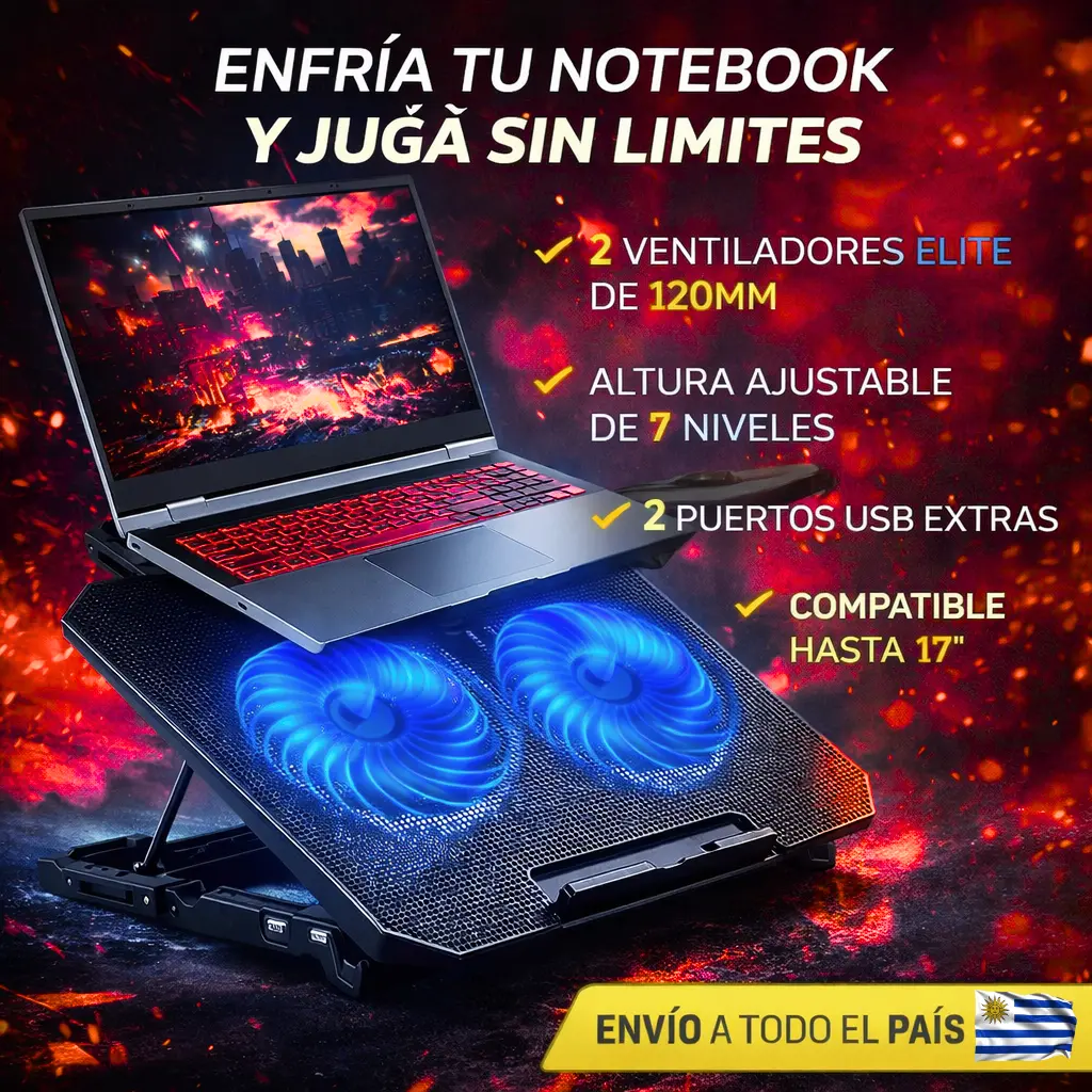 Además, cuenta con 2 puertos USB adicionales, iluminación LED gamer y compatibilidad con notebooks de hasta 17 pulgadas, adaptándose a la mayoría de los equipos del mercado.