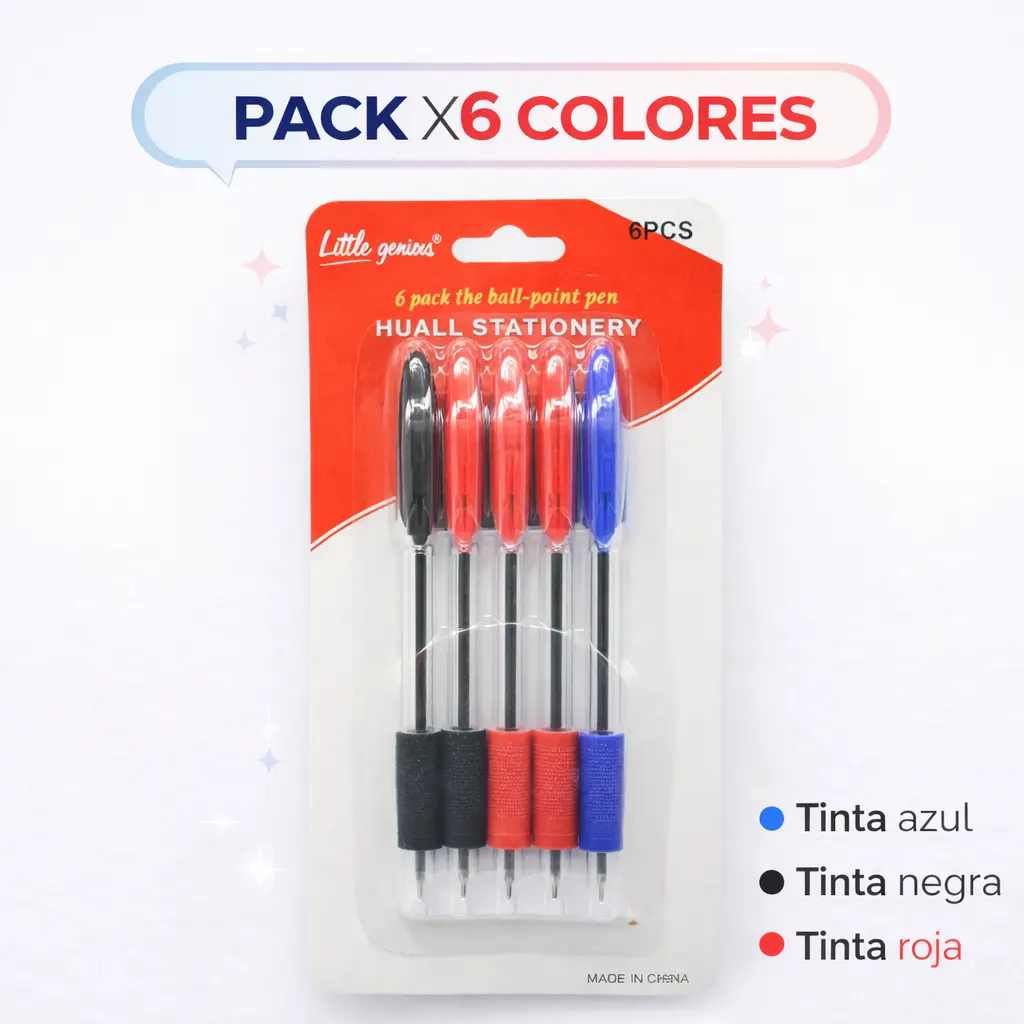 Práctico set de 6 lapiceras de colores ideal para uso escolar, oficina o tareas diarias. Su tinta ofrece una escritura fluida y uniforme, perfecta para tomar apuntes, corregir o trabajar con diferentes colores.